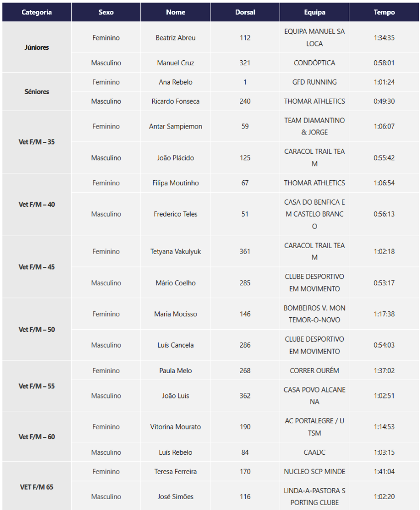 Vencedores: (Júnior); Emanuel Cardoso (Sénior); Pedro Januário (Vet M35); Jorge Marcelino (Vet M40); João Domingos (Vet M45); João Almeida (Vet M50); João Machado (Vet M55); Vítor Vieira (Vet M60); (Júnior); Alexandra Oliveira (Sénior); Filipa Moutinho (Vet F35); Carla Barbosa (Vet F40); Maria Santos (Vet F45); (Vet F50); (Vet F55);